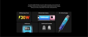 Thân máy được chế tạo từ hợp kim nhôm + nhựa PCTG, mang lại sự bền bỉ và cảm giác cầm tay cao cấp. Kích thước nhỏ gọn (23.8 × 14.0 × 112.7mm) và trọng lượng chỉ 45g, giúp bạn dễ dàng mang theo bên mình mọi lúc mọi nơi. Thiết kế điều chỉnh luồng khí bên hông (Side AFC) cho phép bạn tùy chỉnh lượng gió vào, từ đó tối ưu hóa hương vị theo sở thích cá nhân.